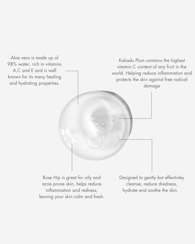 This soothing gel cleanser is formulated with hydrating aloe vera, kakadu plum (containing 100 times more vitamin C than that of orange) and rosehip to gently cleanse, brighten and soothe whilst helping to reduce redness, irritation and neutralise free radicals. 5.07 FL OZ / 150ML