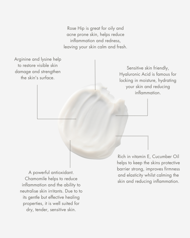 Intensely hydrates, repairs damaged skin whilst reducing redness and calming the skin.